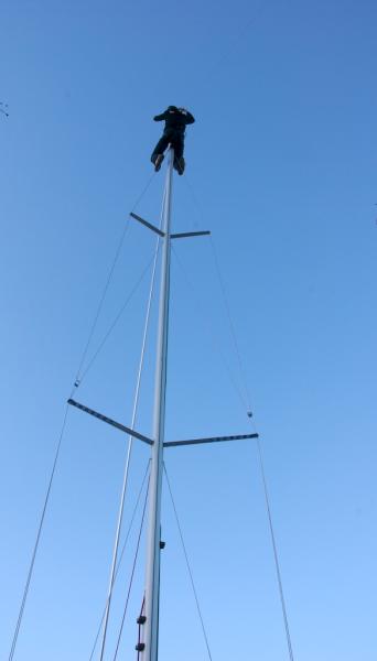 Bland annat har popnitarna för gennacker-fästet uppe i masten börjat lossna och behöver bytas ut. Sedan behöver den fina LED-lanternan ett fäste för att kunna skruvas fast i mast-toppen.