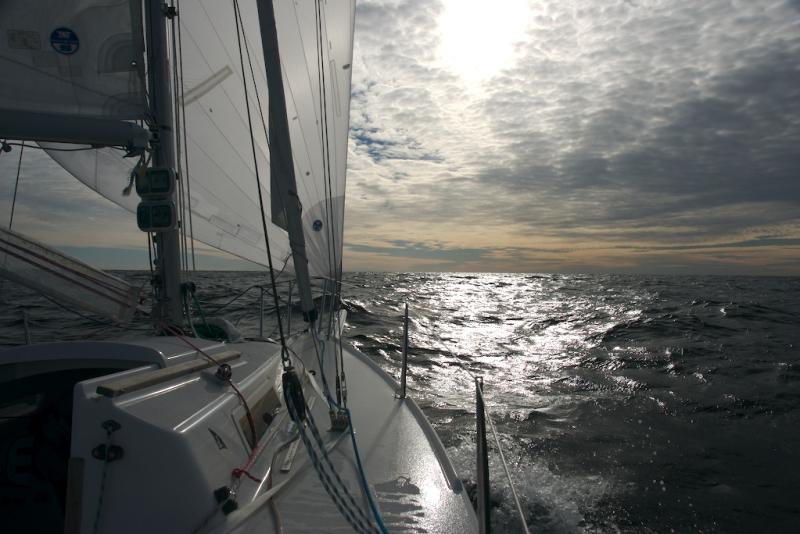 Lördagen började med alpin start 06.00. Båten var täckt med rimfrost och vi tände pannlamporna och fortsatte där vi slutat dagen innan. Två timmar senare seglade vi iväg mot Sandön. Efter allt stress med att fixa båten och planera inför seglingen kändes det skönt att vara ute på vattnet igen. I den nordliga vinden gick det snabbt söderut för oss under gennacker. Sjön var gropig och vinden frisk och seglingen toppen! Då det började mörkna var vi trötta och behövde vila. Gennackern fick åka ner i påsen, focken rullades ut och självstyrningen monterades. Lite mat från Drytech och några extra lager kläder höll tillfälligt borta kylan men när solen försvann blev det riktigt kallt.