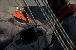 Ett halvt dygn efter senaste rapporten från oss minskade vinden såpass att det gick att segla med stormfock och bottenrevad stor. Arbetsamt i den grova sjön men skönt att röra på sig igen. Senare på natten var sikten dålig och vi seglade in i vad som först kändes som en vägg av vatten men som snabbt följdes av mycket hård vindar. Det var knappt J80:n gick att segla med stormfock och alla rev i storen. Sikten minskade snabbt till bara några meter och regnet piskade i ansiktet så man knappt kunde hålla ögonen öppna. Samtidigt flög båten fram över det av regn tillplattade havet. Det kändes som om vi och båten förflyttats till en annan planet. Lika plötsligt som det kom försvann ovädret. Vi gissar att det vi stötte på var en så kallad squall (en sorts åskby), någon som kan bekräfta det?