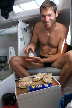 Bra mat kräver ett bra kök. Eller något sånt. :-) En gourme-kock skulle inte hoppa av gläde om han såg köket i J80:n. Maten under segling blir därefter. Efter att plågsamt smakat oss igenom alla olika märken av frystorkad mat fastnade vi slutligen för Drytechs mat. Det fina med deras mat är just att den inte smakar frystorkat. Helt okej mat. Köket snickrades ihop i källaren till vår glädje och våra grannars förskräckelse. När köket var klart låg det sågspån ända in i tvättstugan...