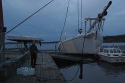 Båten står nu på land på Lidingö Brandstation och väntar på att lådorna ska monteras. Masten lämnade vi på Benns som ska gå igenom riggen och montera ett extra fall och backstag. Stor och fock är hos North som ska sy om focken och sy i ett tredje rev i storen.