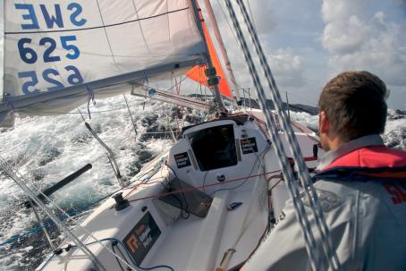 Resan hem från Sandhamn blev nästan ännu mer spektakulär än Gotland Runt. Nordostliga friska vindar gjorde att vi seglade de 23 sjömilen hem på bara tre timmar. Vid Runmarö hissade vi gennackern och sedan slutade inte båten plana förrän vi var tvungna att riva en bit in på Ingaröfjärden. Vi låg konstant runt 9 knop med toppar på 12-13 knop. Precis innan vi rev gennackern stack båten iväg på en toksurf i drygt 15 knop. J80 är verkligen en helt otroligt rolig båt!
