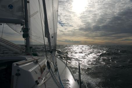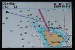 Efter 23 timmar på Fårö gav vi oss av hemåt. Det började lite långsamt men efter några timmar friskade det till. Med jib-topen satt snittade vi 8 knop under fyra timmar, ibland var vi uppe runt 10 knop. Enda nackdelen med jib-topen var att självstyrningen inte fungerade. Fast just då var det ingen som klagade utan vi klunsade istället om vem som skulle få styra.