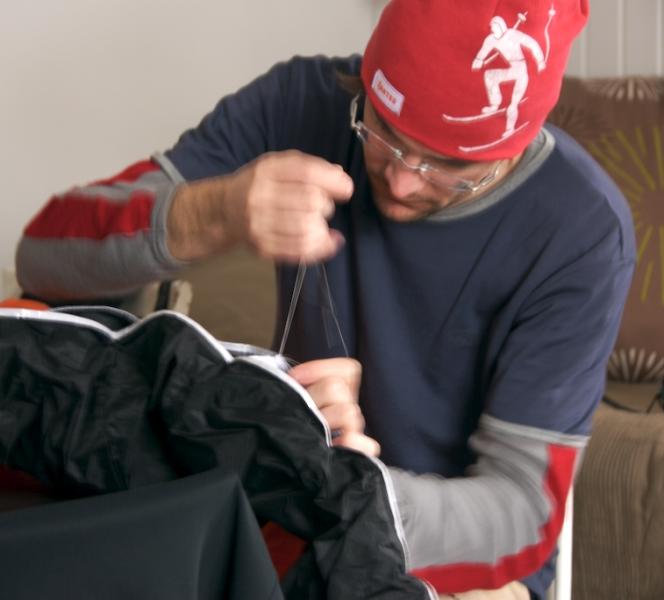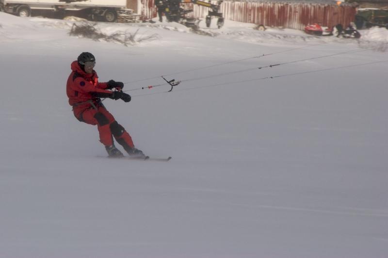 Nästa dag hade vinden avtagit till mer beskedliga 10-15 m/s. Vi var båda nervösa när vi packade upp den 4 kvadrat stora foilen och klunsade snabbt om vem som skulle få börja. Andreas vann, kopplade in kiten i selen och försvann snabbt bort i snöröken på sjön. Efter några försök fram och tillbaka hade han kommit på hur man tog höjd med kiten och kom tillbaka med ett stort leende.